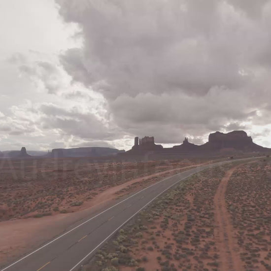 Monument Valley drone footage, desert highway, American Southwest, Utah Arizona border, cinematic drone video, red rock buttes, desert landscape, road trip b-roll, moody skies, Western landscape, travel film footage, Navajo Nation, aerial stock footage, cinematic desert, 4K drone shot, open road, sandstone mesas, iconic America
