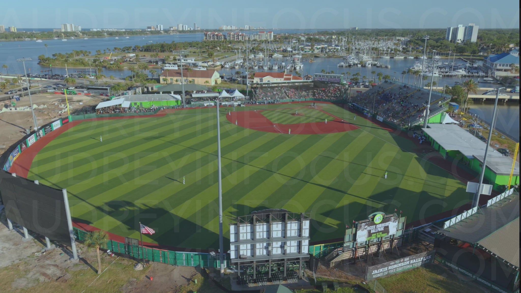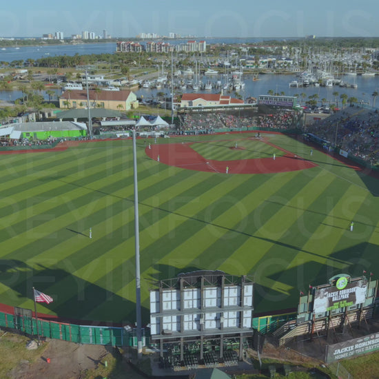 Aerial drone footage of Jackie Robinson Ballpark in Daytona Beach, Florida, with views of the baseball field, marina, and surrounding cityscape. Captures a live game in progress with fans in the stands and players on the field. Ideal for sports, tourism, or Florida-based storytelling. Shot in clear weather with vibrant colors and dramatic stadium lighting shadows.